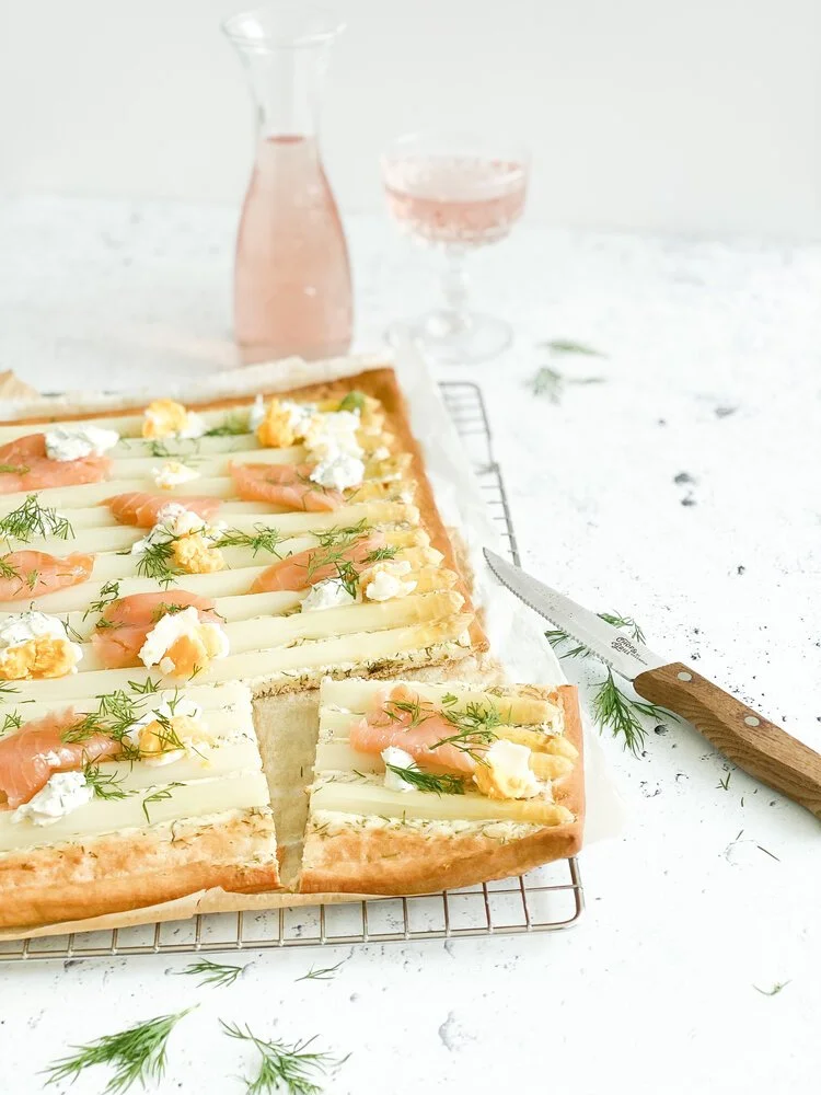 - Haal de plaattaart met asperges uit de oven. Verdeel de eieren over de plaattaart. Beleg de plaattaart met de gerookte zalm en garneer met de crème fraîche en wat verse dille. Serveer meteen.